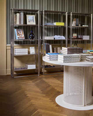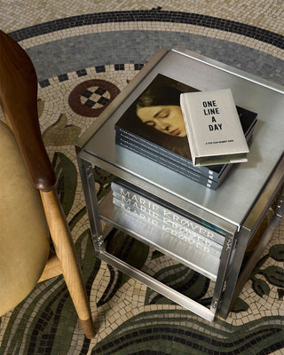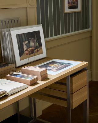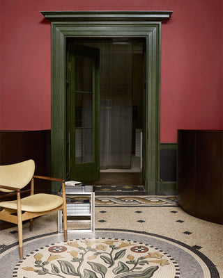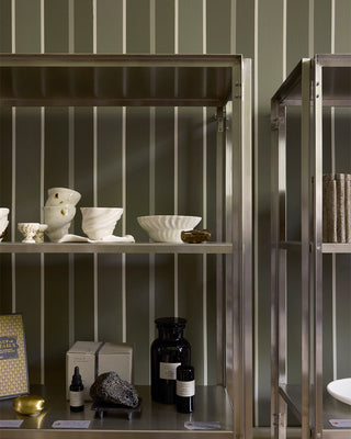The interior design draws inspiration from the quiet elegance of Vilhelm Hammershøi’s interior paintings. A thoughtful combination of brushed steel shelving and warm wooden elements creates a balance between structure and softness. Kristina Dam Studio’s Japanese Cabinet and Foldable Floor Shelf create a functional and harmonious framework, where steel and wood meet in a balanced expression, allowing each product to take center stage while inviting visitors to explore and engage.