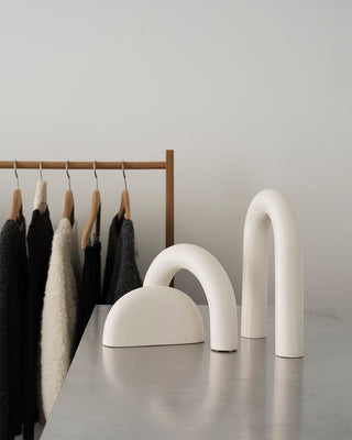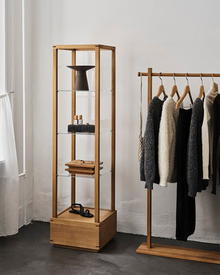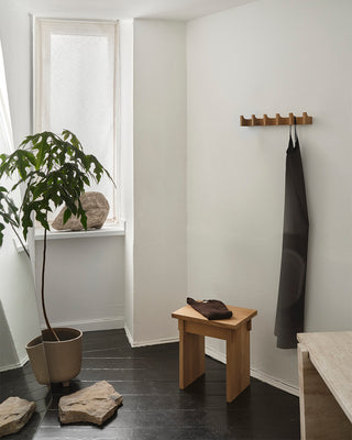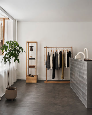 The fitting room extends the store’s aesthetic with minimalist décor, where raw materials meet warmer elements. Our Artisan Stool and Column Coat Rack stand alongside plants and stones collected directly from nature, creating a tranquil atmosphere where customers can immerse themselves in the feel and fit of the garments.