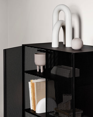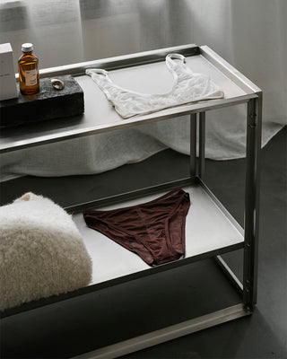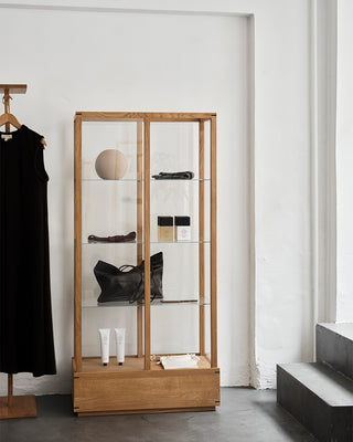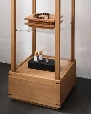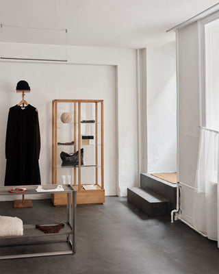 The front part of the shop is designed with honest materials: raw walls, concrete floors, and furniture in oiled oak and stainless steel. Our Japanese Cabinets and Foldable Console create a serene frame around the curated selection — a carefully chosen blend of vintage pieces and collections from brands with a sustainable vision. Delicate jewellery and beauty products are displayed on airy glass shelves, while lace and silk are highlighted in striking contrast to the raw surface of the Foldable Console in stainless steel.