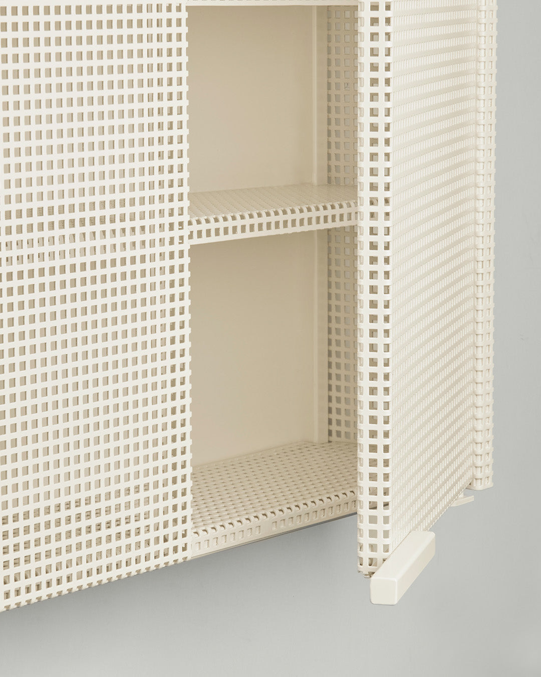 In a light beige finish, the Grid Wall Cabinet offers a soft and stylish storage option. This European made cabinet features the same high-quality construction as its black counterpart, with powder coated perforated steel and thoughtfully designed slim shelves. The beige colour adds a warm, neutral tone to the room, making it versatile for various interior styles. The transparent aspect of the cabinet allows for an elegant display of contents, while its airy design ensures it doesn't overwhelm the space. Ideal for those seeking a combination of practicality and understated style, the beige Grid Wall Cabinet is a perfect addition to any modern home. Complete your home with one of our products from the Grid series.
