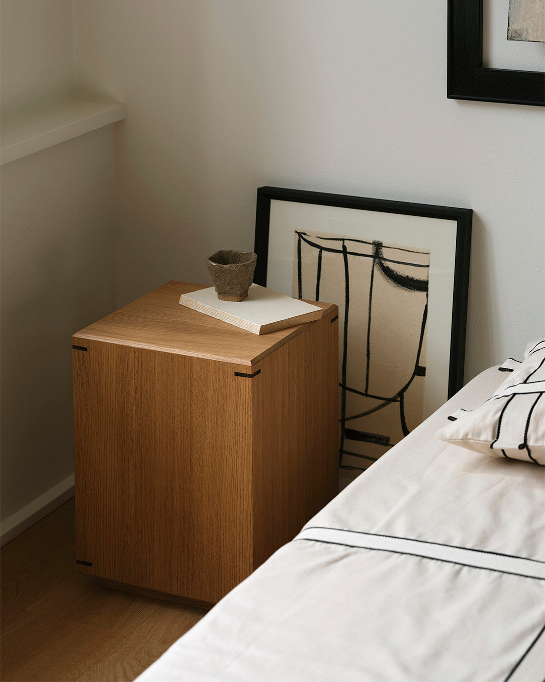 Crafted from oiled oak veneer and solid oak, the Japanese Side Table is defined by a balanced, reduced form. Subtle details, such as the gently faceted surface and the slightly elevated base, create a cohesive and timeless silhouette. As a lower interpretation of the Japanese Pedestal, the piece shares the same design language and serves as a side table, bedside table or a low pedestal. A simple piece defined by material, proportion and craftsmanship.