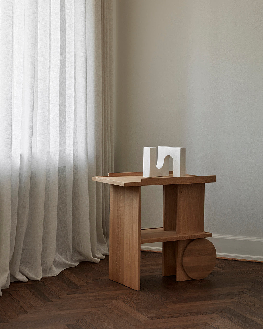 The design of the Axis Side Table consists of geometrical shapes that form a sturdy, timeless side table with references to the classic bar trolley. Axis Side Table is a solid piece of furniture that, with its expressive wheels, makes the side table a moveable object. The clean construction has an architectural and sculptural expression, showcasing the warmth of the wood. The oak wood is coated with a clear lacquer to protect and enhance its qualities. Lacquer creates a hard, durable surface resistant to scratches, dust, and dirt.